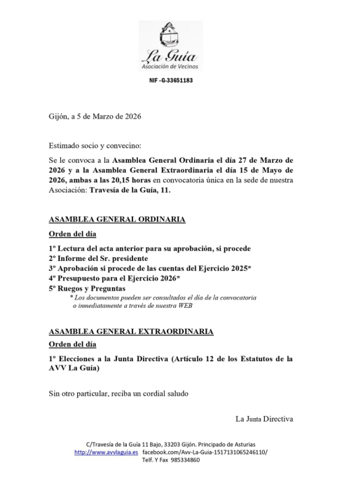 Se le convoca a Vd. a la Asamblea General Ordinaria y a la Asamblea General Extraordinaria que tendrán lugar el próximo día 6 de Marzo de 2015 a las 19,30 horas en primera convocatoria y a las 20 horas en segunda convocatoria en la sede de nuestra Asociación C/. Travesía de La Guía, 11.
