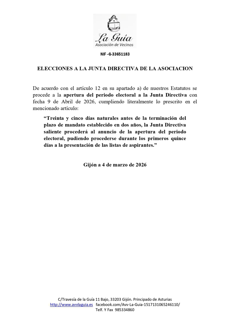 ANUNCIO DE CONVOCATORIA DE ELECCIONES A JUNTA DIRECTIVA DE LA AVV DE LA GUIA